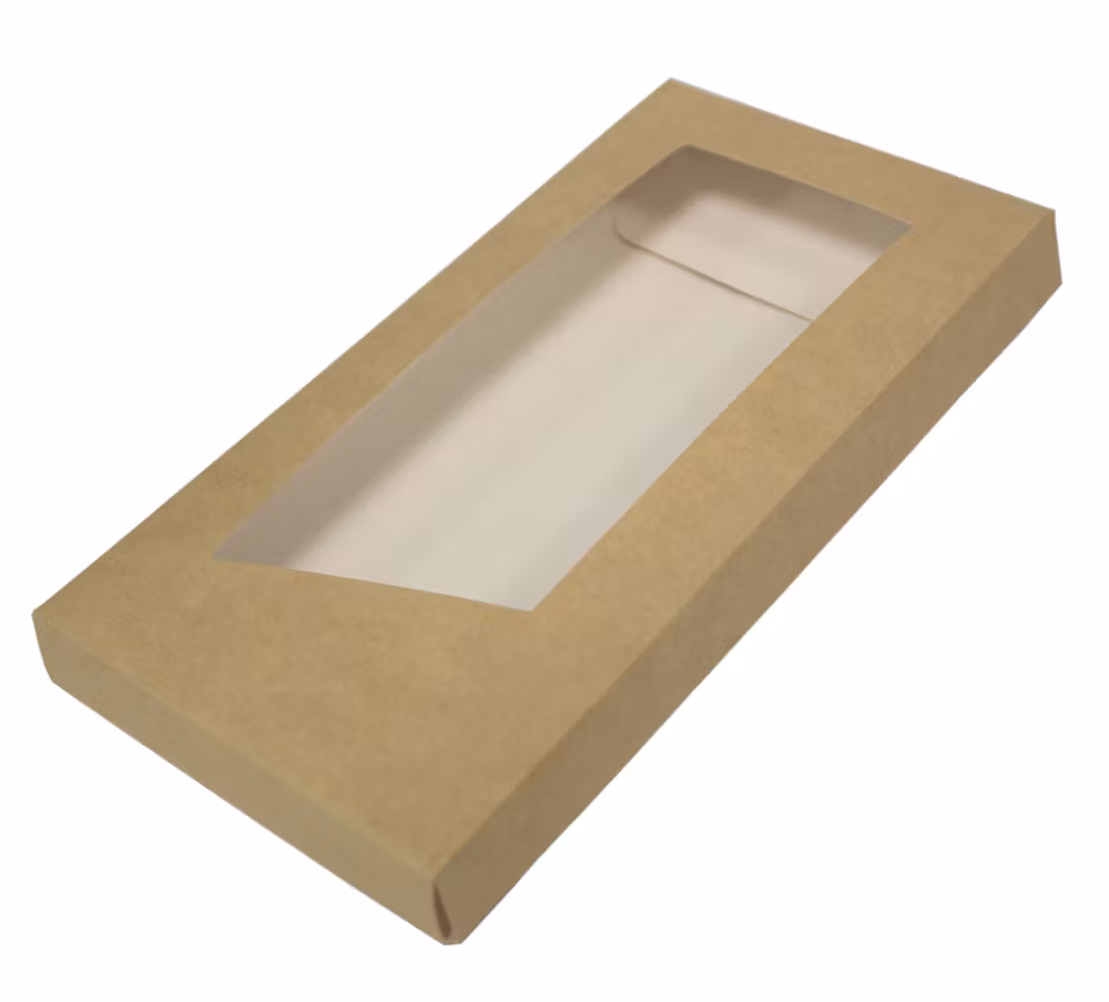 En ljusbrun eco chokladförpackning gjord av högkvalitativ kartong med ett fönster som perfekt exponerar tillbehör/struktur