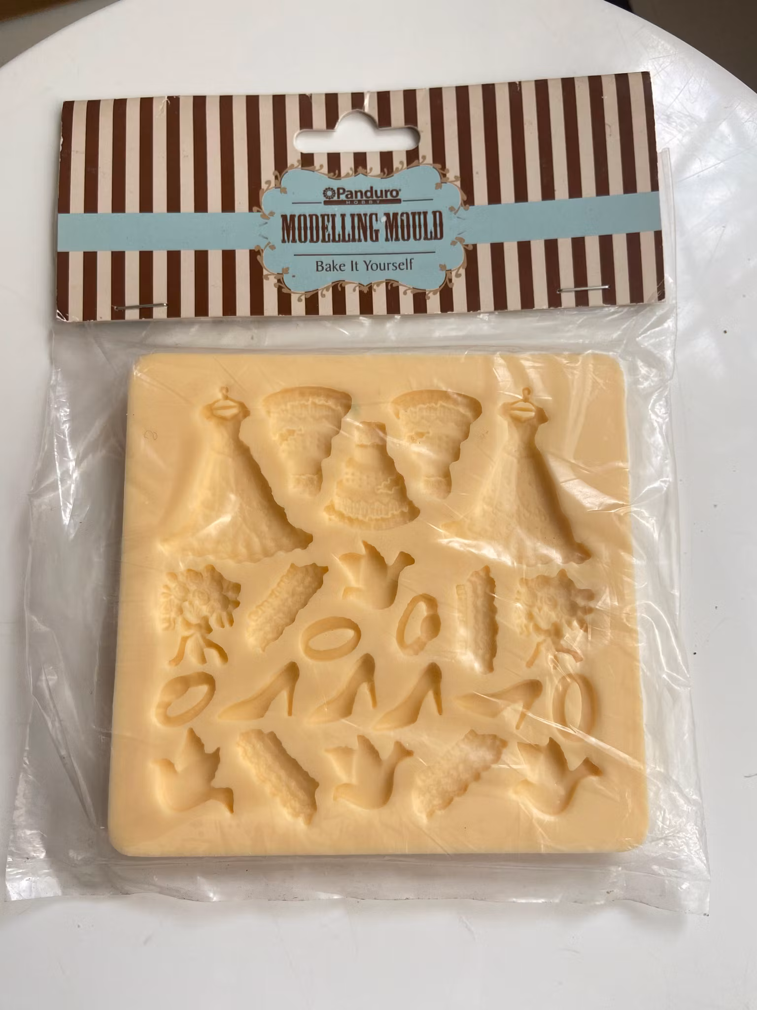 Charmig modellform från Panduro med bröllopstema, perfekt för att skapa fina dekorationer till tårtor, cupcakes och andra bakverk. Motiven inkluderar brudklänningar, skor, blommor, ringar, fåglar och andra detaljer som passar utmärkt till bröllopstårtor.