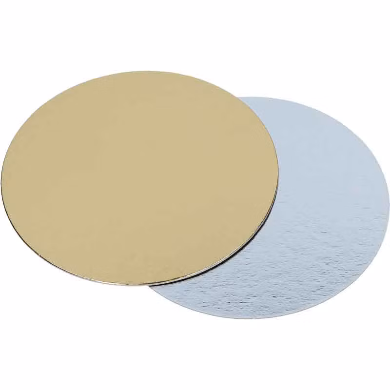 Tårtbrickor av god kvalitet i folierad kartong. Brickan är vändbar med guld på ena sidan och silver på andra, fungerar bra både som tårtbricka eller som mellanlager i en våningstårta.